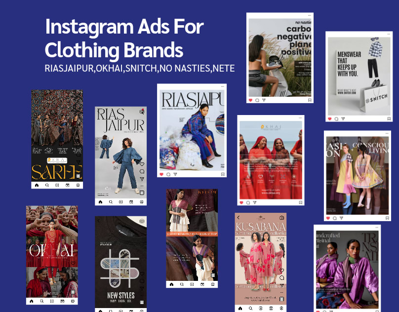 The designs were inspired by fashion brands such as RIAS Jaipur, Okhai, Snitch, No Nasties, and Nete. The creatives combine fashion photography, structured layouts, and bold typography to showcase products in a clean and modern way. Every ad focuses on presenting the clothing clearly while maintaining a strong visual hierarchy so the viewer’s attention goes directly to the product.