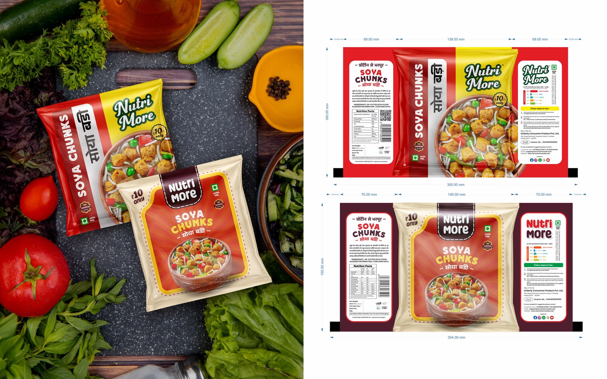 Packaging design created for Nutri More Soya Chunks, a protein-rich product designed for everyday healthy meals.