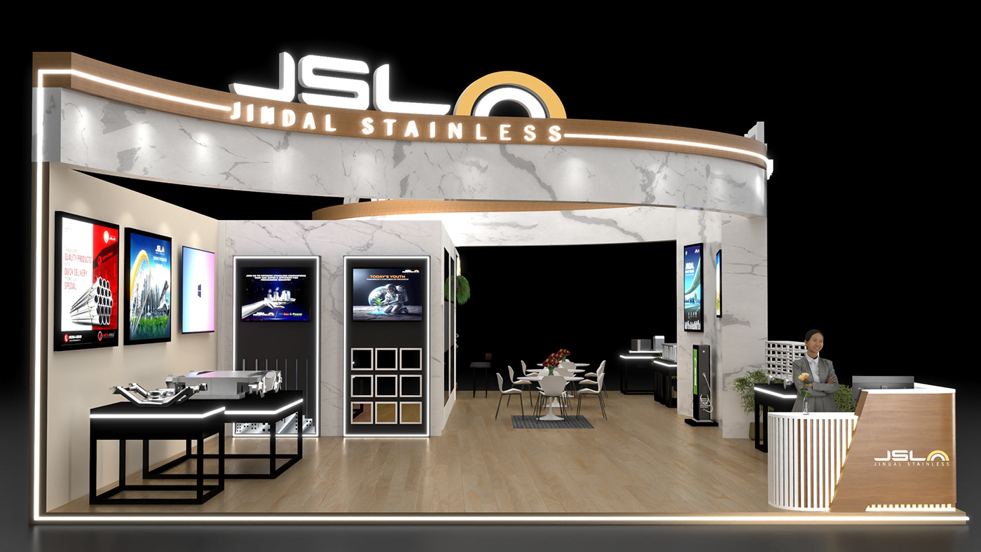 This project showcases a contemporary 3-sided open exhibition stall designed for JSL (Jindal Stainless). The concept blends modern architectural aesthetics with strong brand identity to create a bold and immersive trade show presence.
