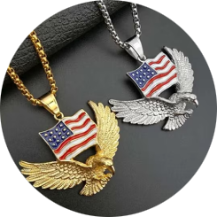 The American Eagle Pendant showcases a striking eagle design that reflects power and independence. Its bold look complements any style, making it a meaningful accessory.