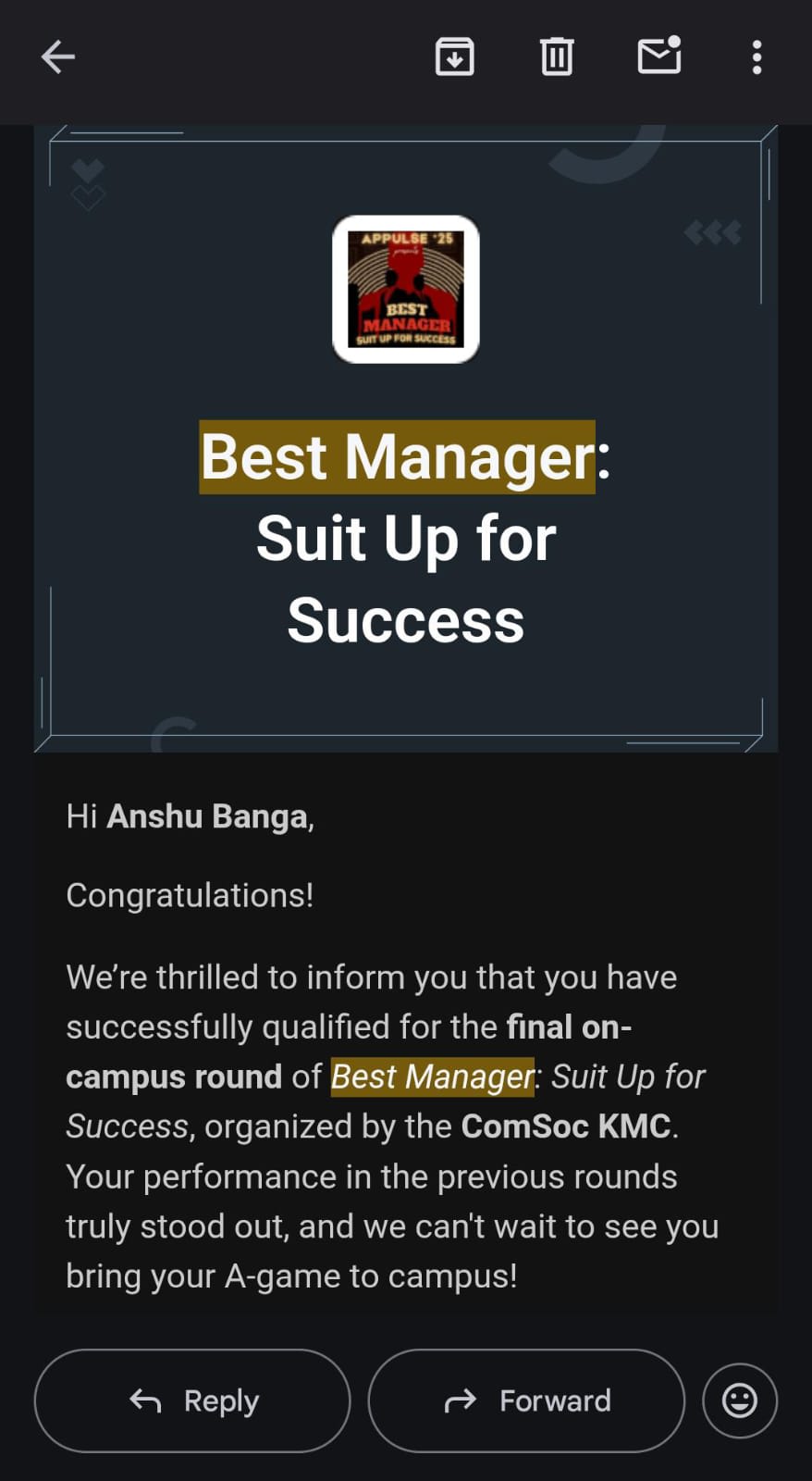 About: I reached the final round of Best Manager: Suit Up for Success, a high-stakes management competition organized by the Commerce Society of Kirori Mal College, University of Delhi. Out of 485 registered participants, the competition tested leadership, strategic thinking, and crisis management skills across multiple rounds, inspired by real high-pressure corporate scenarios.