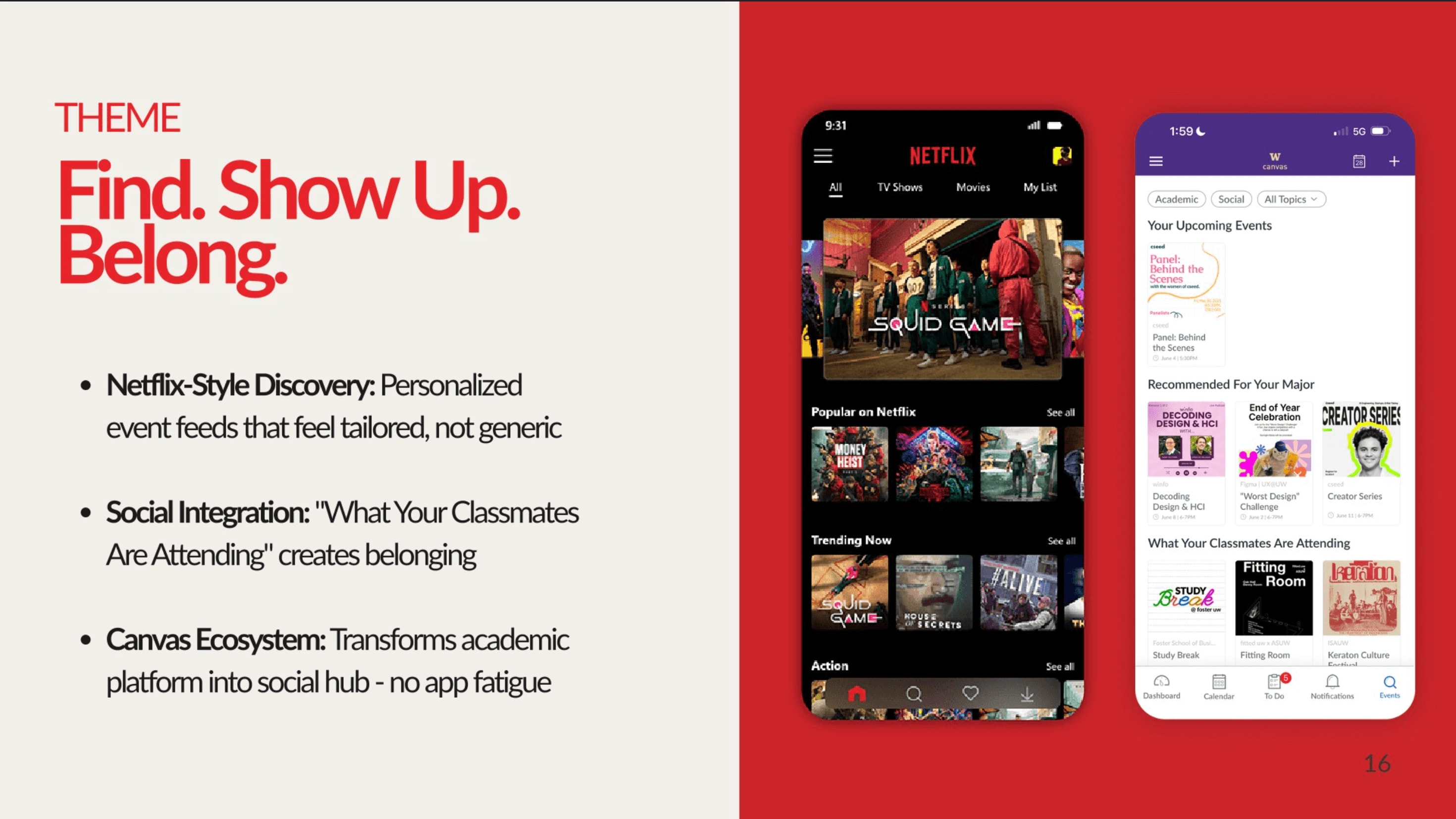 We designed and prototyped Canvas+ Events, a platform integrated directly into the Canvas LMS to create a centralized, personalized hub that helps students find events, connect with peers, and feel a true sense of belonging. It features a "Netflix-style" interface with visual, scrollable event cards, making discovery intuitive and engaging. Key features include: