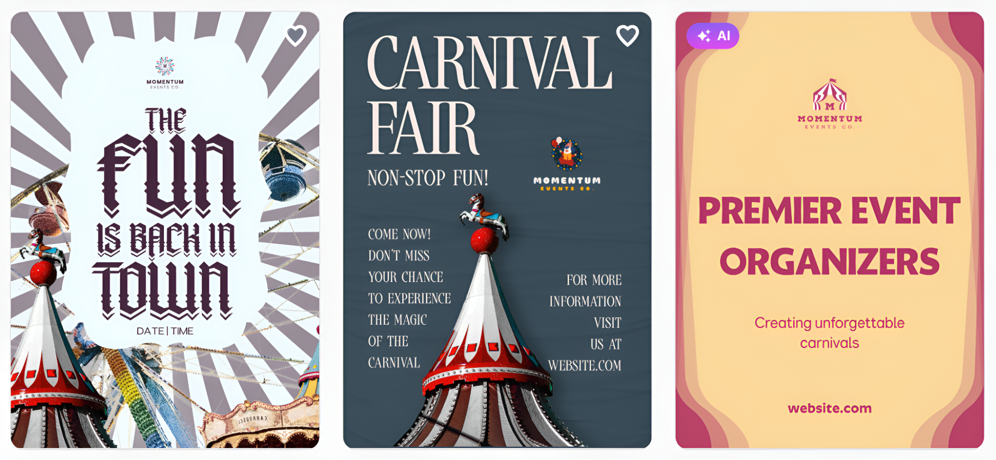 Using Momentum Events Co. as the business name, the AI instantly pulls together layouts, brand colors, and typography that feel intentional and cohesive across every asset.