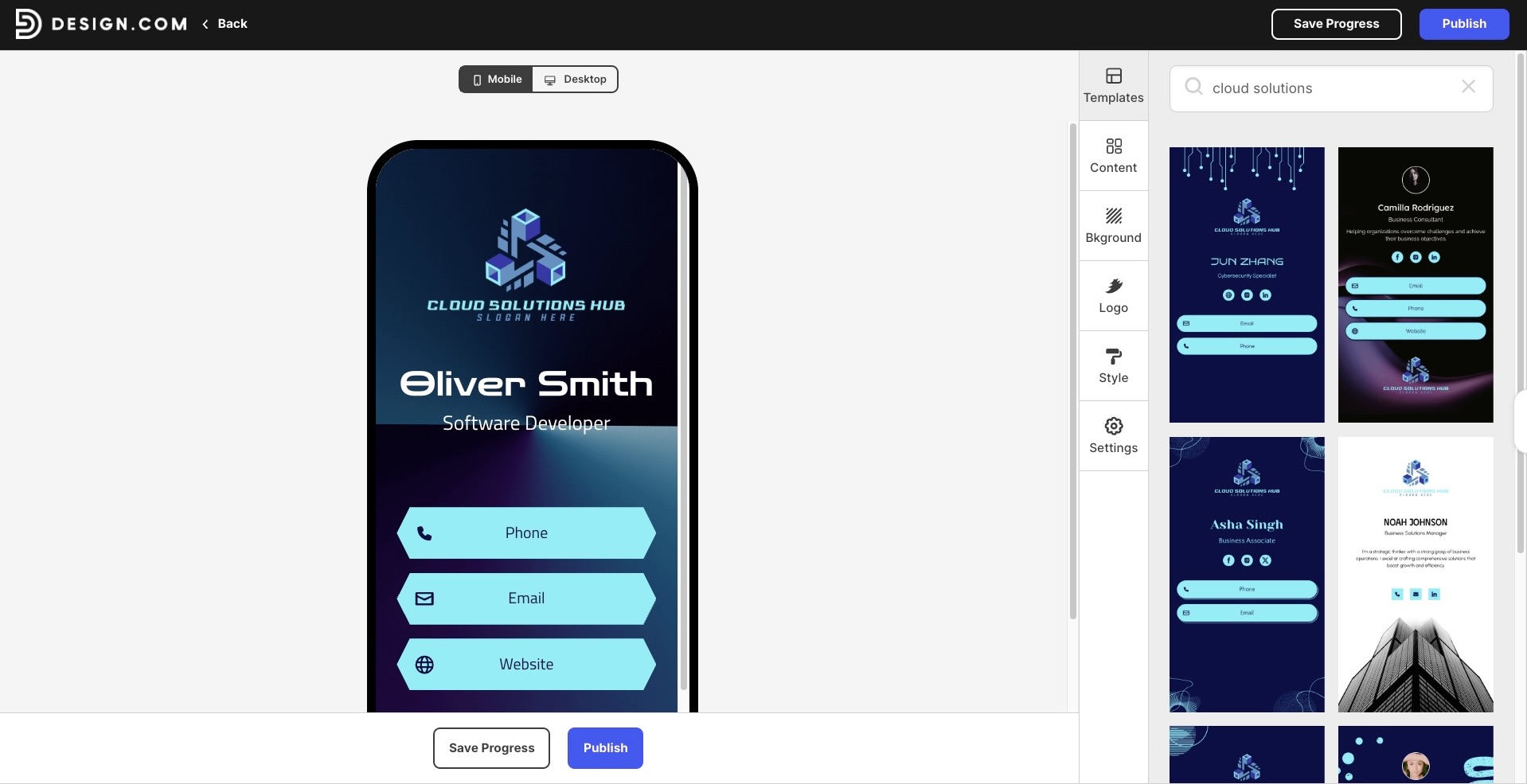 Design.com tops our list for one simple reason: it covers everything. From standout visuals to smart functionality, the tool’s digital business card maker brings together design quality, practical features, and brand consistency in a way no other tool on this list manages to pull off.