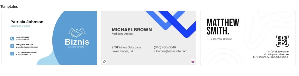 Adobe Express is a lighter version of Adobe's design suite, covering a range of graphic design tasks, including digital business cards. It is one option among many within the platform rather than a dedicated card-making feature.