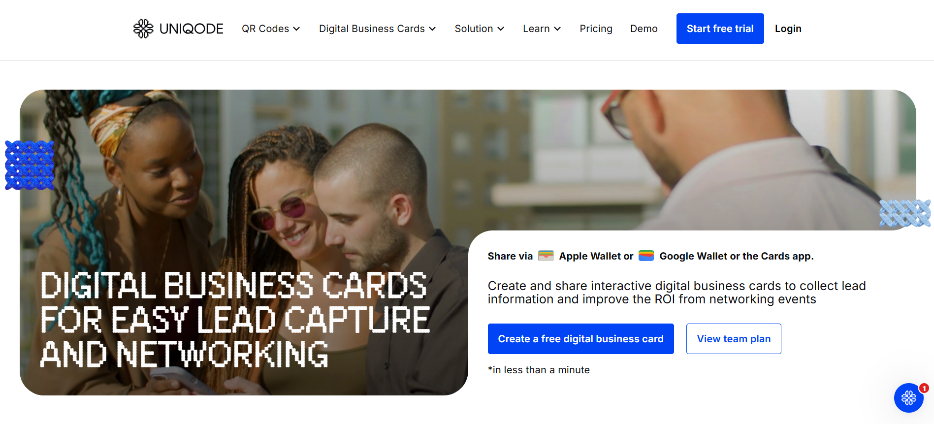 Uniqode is a functional pick for teams that need tracking data alongside their cards. The price point is higher than most on this list, and the value largely depends on how much the analytics features matter to your specific use case.