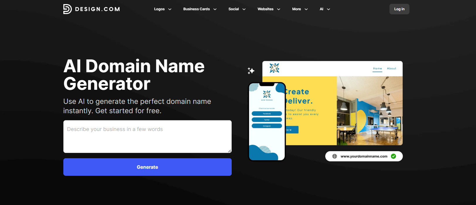 Design.com’s AI domain name generator helps users generate the perfect domain name quickly using advanced AI technology. By entering your business description via a simple prompt, the generator produces relevant, memorable, and SEO-friendly domain options. Once you select your favorite, registration is simple, giving you full control to use it on your website or for email.