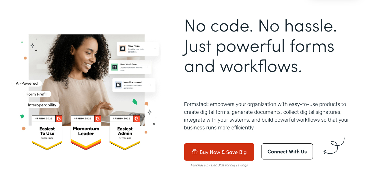 Formstack is built specifically for high-security, enterprise-level workflows. While it may not be as flashy as others, it’s great for organizations in healthcare, finance, or government that require strict compliance. It's a productivity suite that handles secure data collection, automated document generation, and e-signatures. If your primary concern is data privacy and complex internal approvals, Formstack is a good choice.