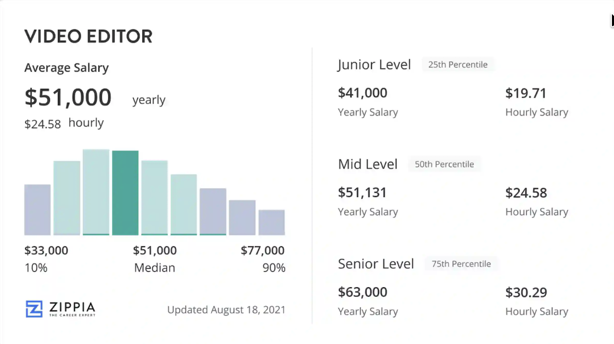 In the United States, the average salary for a video editor is around 59,810 dollars per year. That is about 50 lakh rupees per year. Entry-level editors make around 34,600 dollars per year (about 29 lakh rupees). Experienced editors make 105,000 dollars per year or more (about 87 lakh rupees).