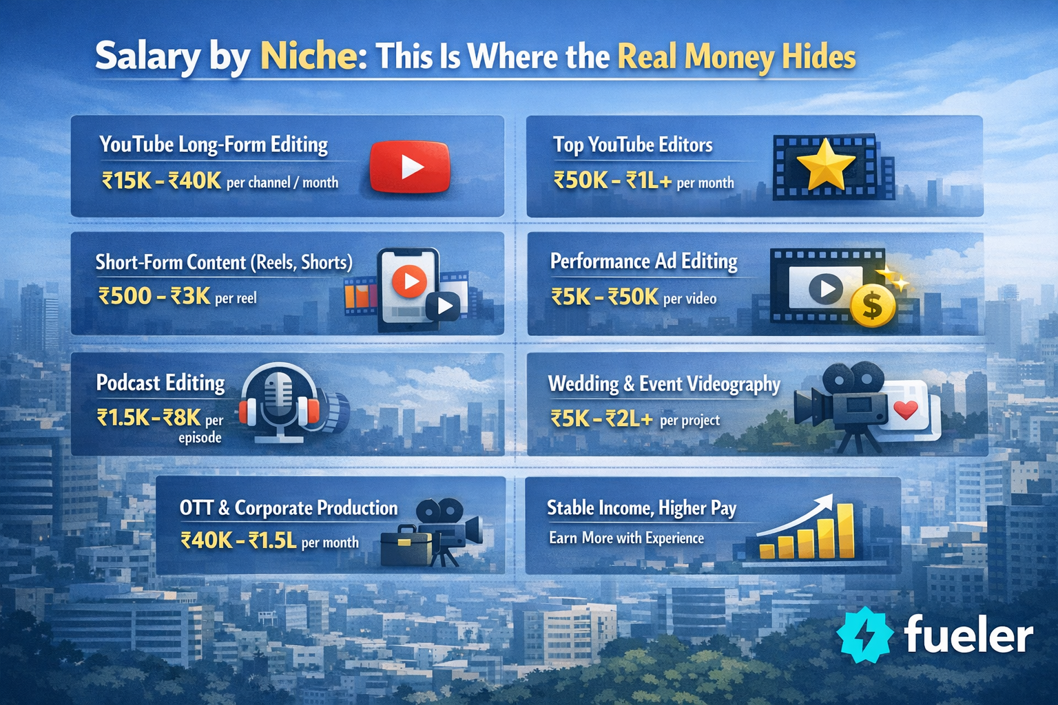 If you want to cross ₹20L per year: Focus on international clients, high-ticket niches like performance ads or OTT production, or building a small agency model. Your Fueler profile becomes a full brand statement at this point, not just a portfolio.