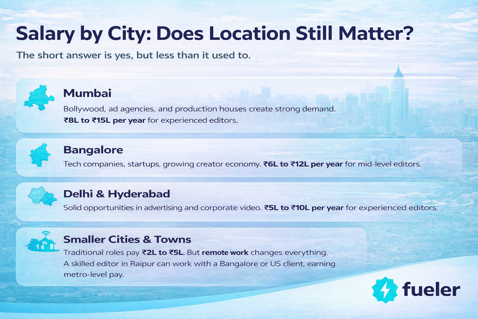 Smaller cities and towns tend to pay less in traditional salaried roles, often ₹2L to ₹5L. But here is the thing: remote work has changed this completely. A skilled editor in Raipur or Coimbatore can work with a client in Bangalore or even the US, earning the same as someone sitting in a metro. Your postal code does not have to limit your income anymore.