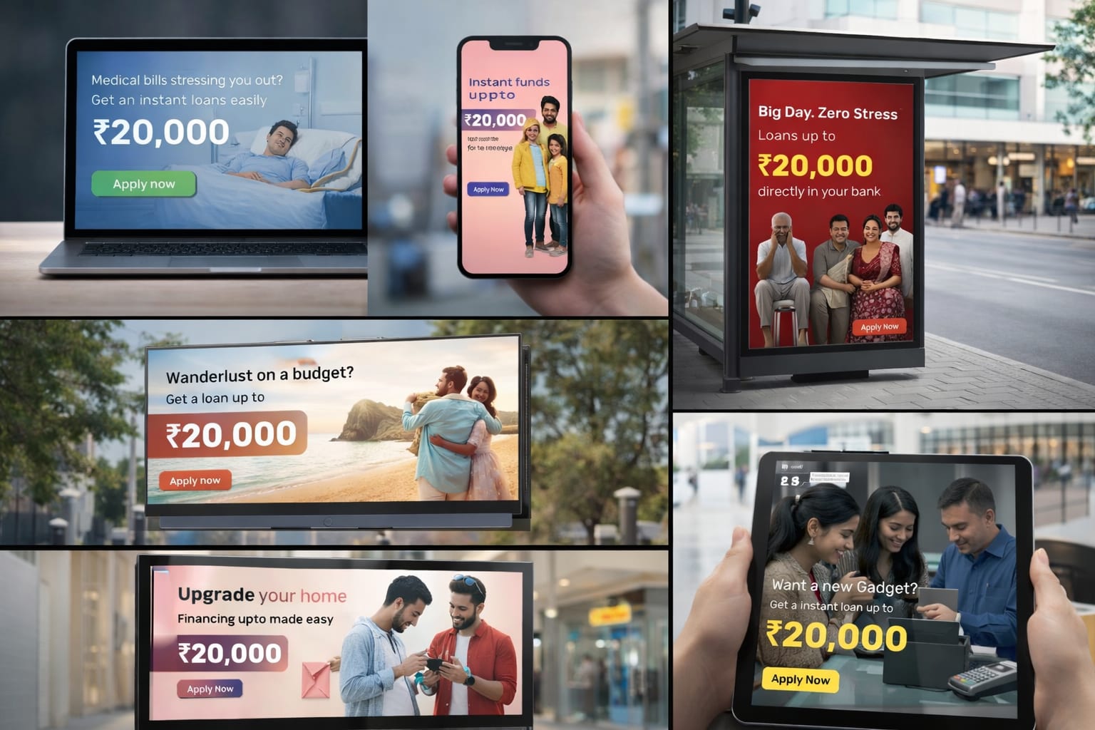 Instant Loan Banner Campaign | Fintech AdvertisingA strategic banner campaign designed to promote instant loans up to ₹20,000 across multiple real-life scenarios including medical emergencies, travel, shopping, lifestyle upgrades, gadgets, weddings, and...