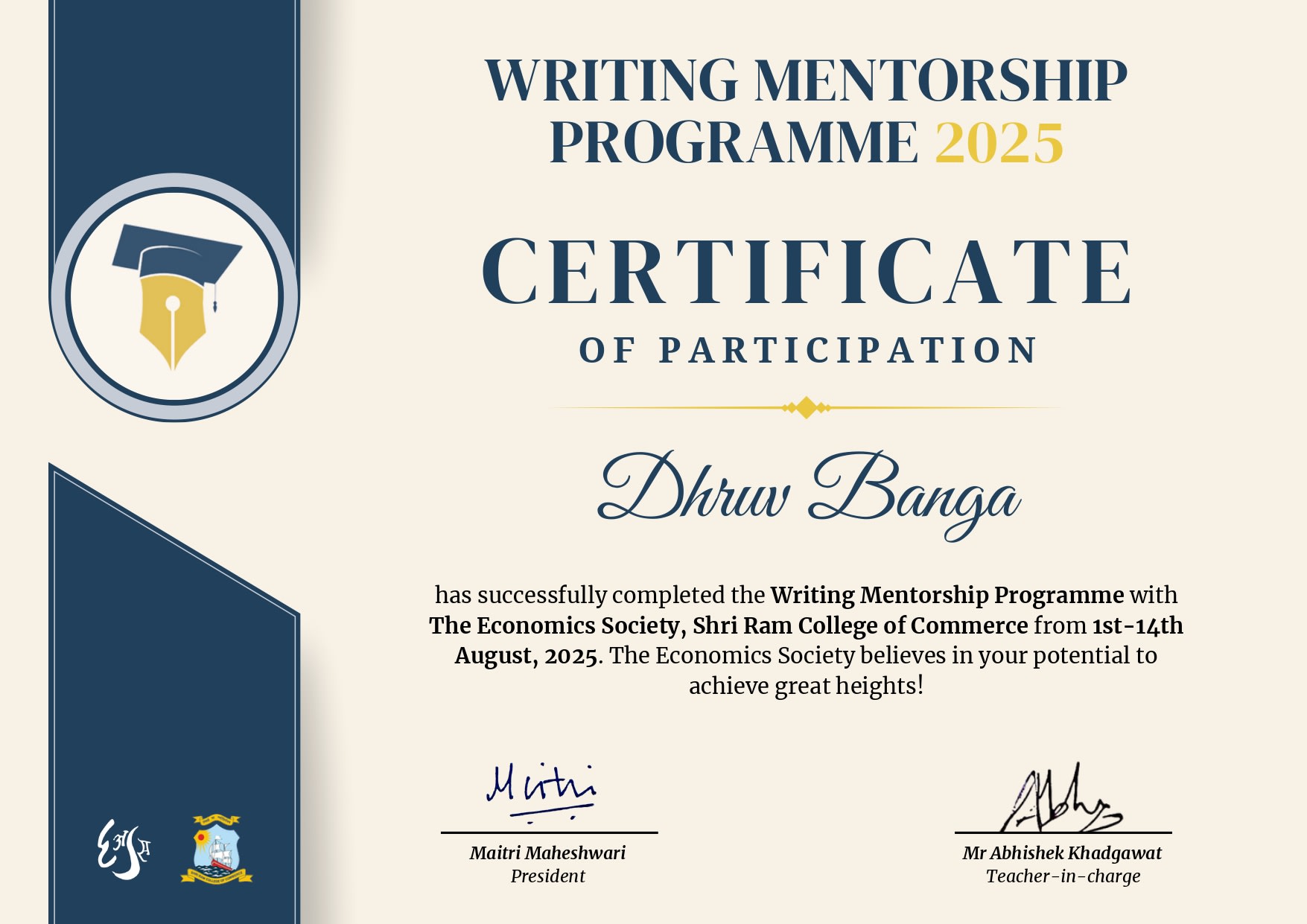 I am very proud to share that I was selected for the Writing Mentorship Programme 2025, organized by the Economic Society, SRCC, in collaboration with @Shri Ram College of Commerce (SRCC), Penguin Random House India, The Indian Express, Business Standard, and ET Education.