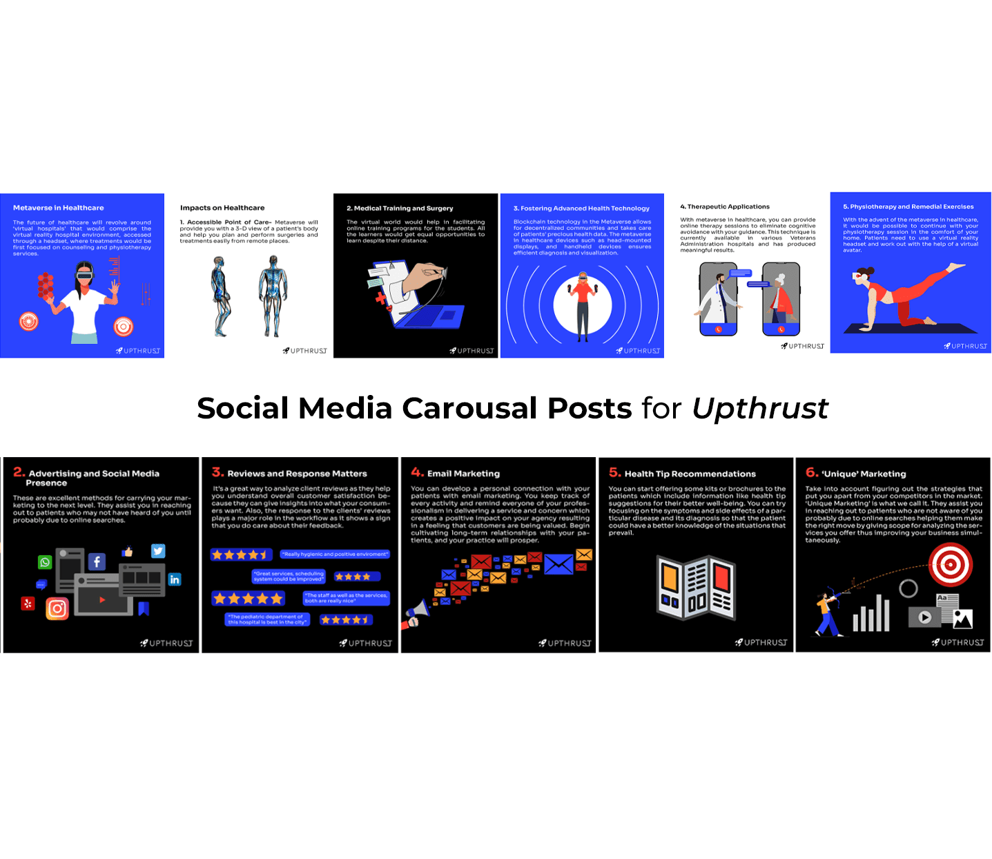 Designed over 15 social media carousel posts for Upthrust, a digital marketing agency, by transforming long-form blog content into concise, engaging visual narratives. Each carousel consisted of 5–7+ slides, totaling 70+ individually designed graphics, crafted to maintain attention, communicate clearly, and drive interaction.