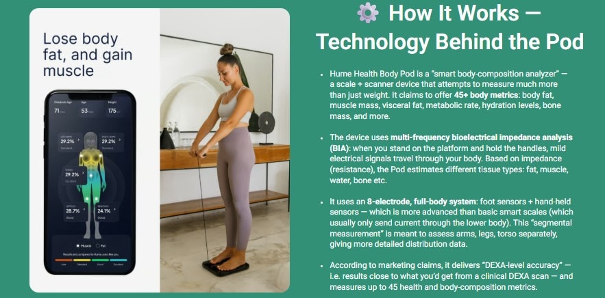 Hume Health Body Pod Canada is a “smart body-composition analyzer” — a scale + scanner device that attempts to measure much more than just weight. It claims to offer 45+ body metrics: body fat, muscle mass, visceral fat, metabolic rate, hydration levels, bone mass, and more.