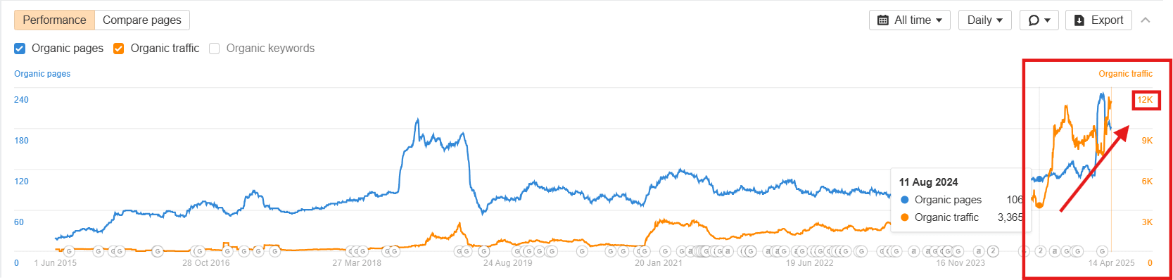 Conducted in-depth keyword research for a US-based Chiropractic Clinic during June–July and implemented content based on those findings across two quarters. Within three months, the website began driving around 11K monthly visits, hitting all-time high traffic despite fluctuations from Google updates. Later joined this project as a PL, setting a clear example of how strategic planning and timely execution can deliver measurable SEO success.