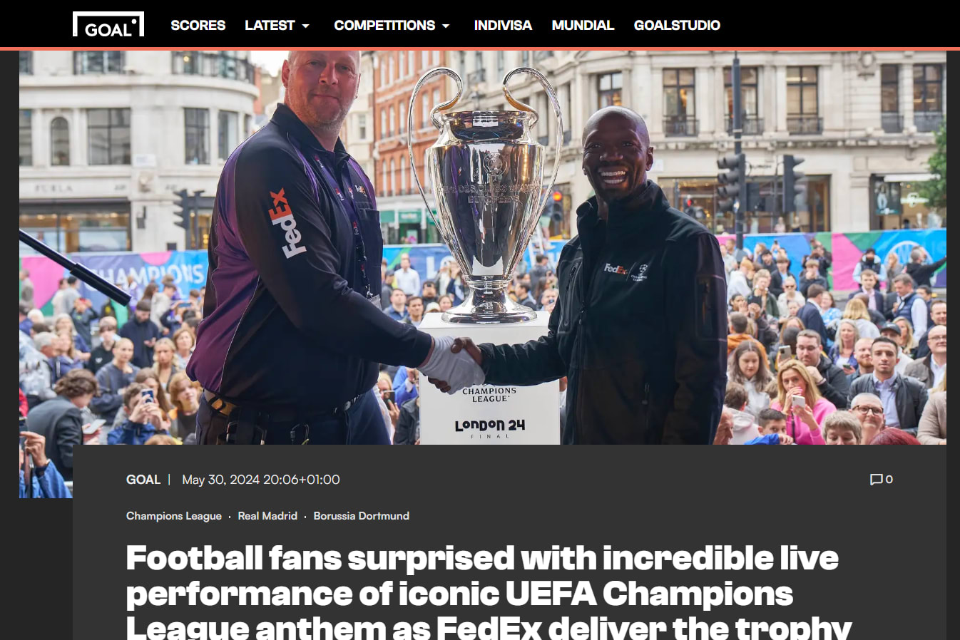 Special coverage for FedEx as the official trophy delivery partner for UEFA Champions League 2024, where the trophy was brought by FedEx driver and ex-Real Madrid star and UEFA Champions League winner, Claude Makelele to Trafalgar Square, London, with the backdrop of Royal Philharmonic Orchestra singing the UEFA anthem at the back.