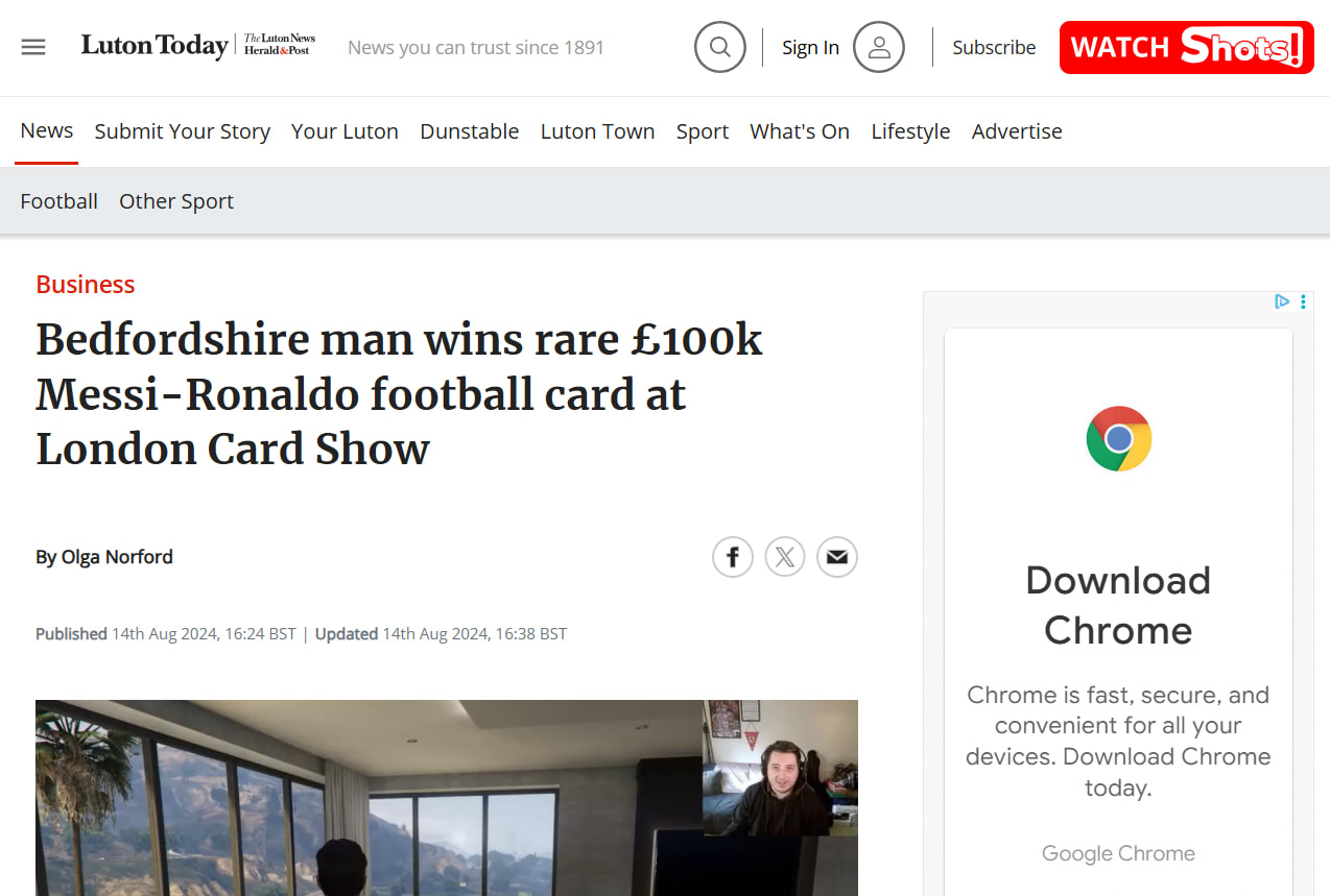 A company director from Bedfordshire has won a rare Messi-Ronaldo football card currently valued between £75,000 and £100,000 at the London Card Show.