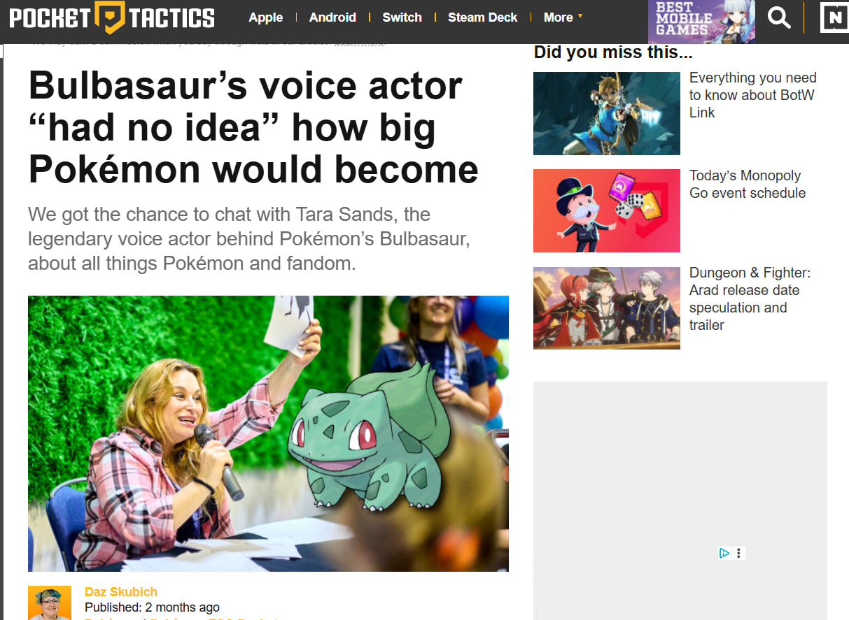 Tara Sands was the talent who attended London Card Show in November 2024. She is the official voice of iconic Pokemon character Bulbasaur. She was interviewed by popular Gaming, Entertainment and Tech news platform POCKET TACTICS.