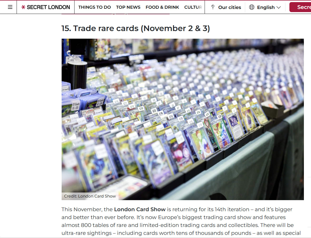 This November, the London Card Show is returning for its 14th iteration – and it’s bigger and better than ever before. It’s now Europe’s biggest trading card show and features almost 800 tables of rare and limited-edition trading cards and collectibles. There will be ultra-rare sightings – including cards worth tens of thousands of pounds – as well as special guest meet-and-greets, workshops, a retro gaming arcade, and more.