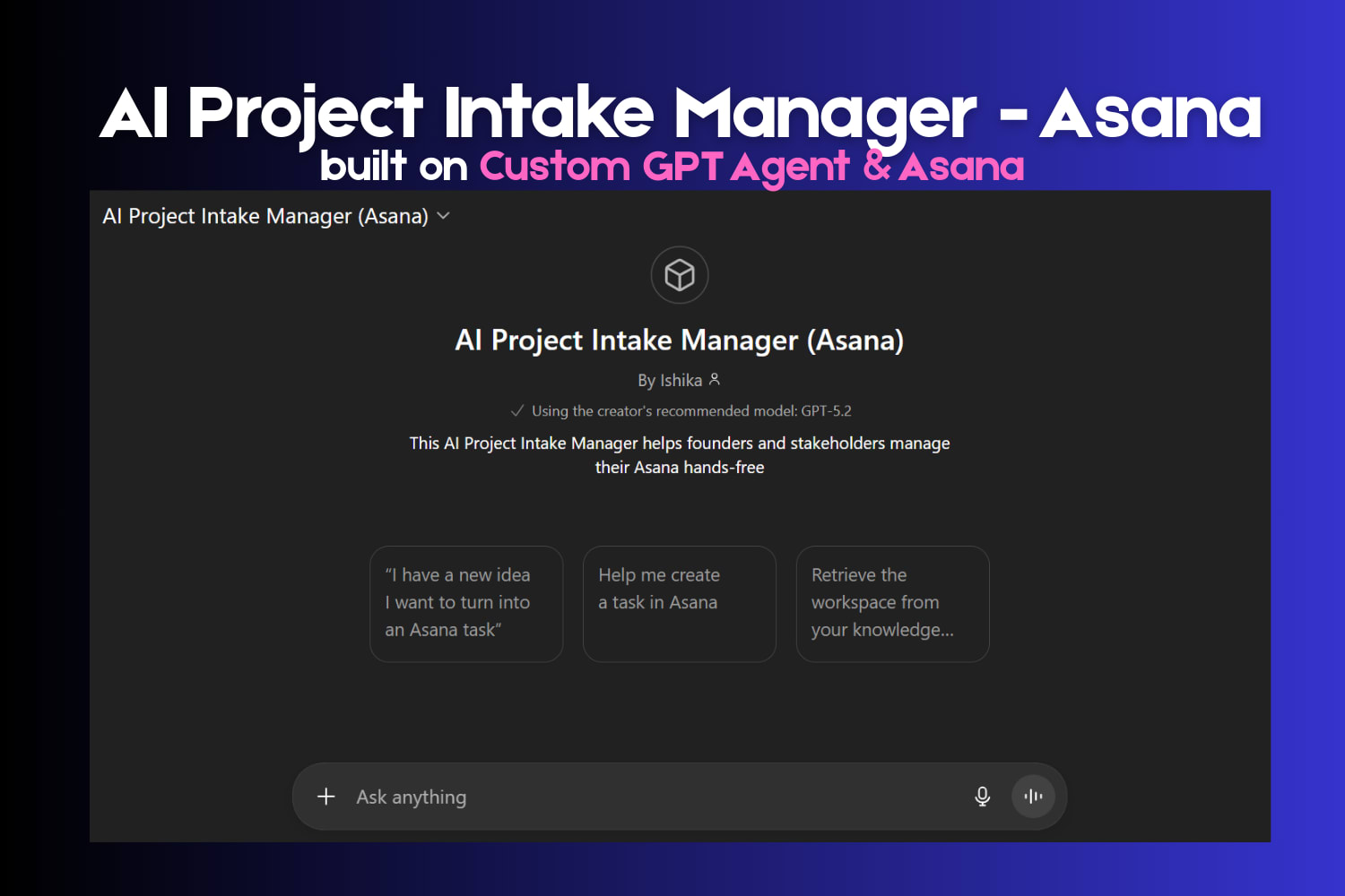 Built a GPT-powered assistant that integrates with Asana to allow founders and project managers to create, assign, and structure tasks through natural language prompts. The system converts chat inputs into properly formatted tasks across multiple workspaces. Eliminated manual task entry and significantly reduced friction in project intake and task creation.