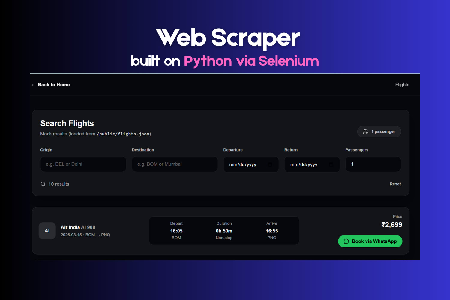 Developed a custom Python + Selenium scraper to extract flight pricing and schedule data from a website with strict anti-bot protections. The automation navigates the booking flow to reach flight results and captures structured data for a custom search interface. Enabled reliable flight data extraction where existing APIs and scraping tools failed.