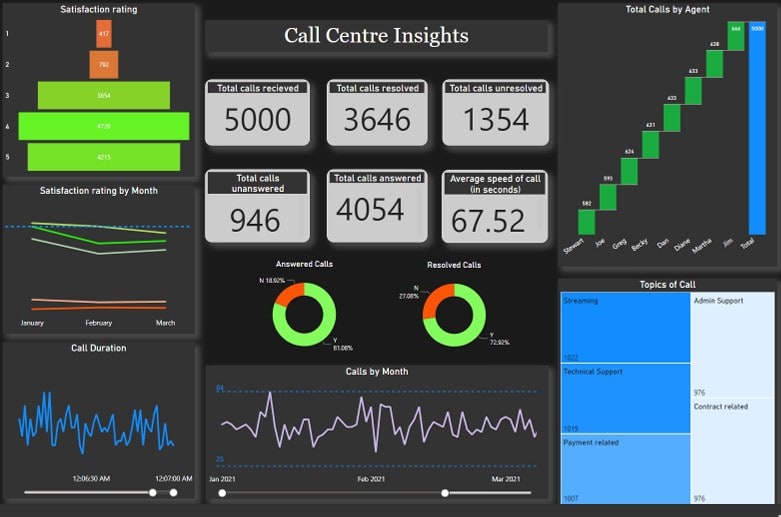 ->Analyzed operational KPIs such as call resolution rates, customer satisfaction, average handling time, and unresolved queries.