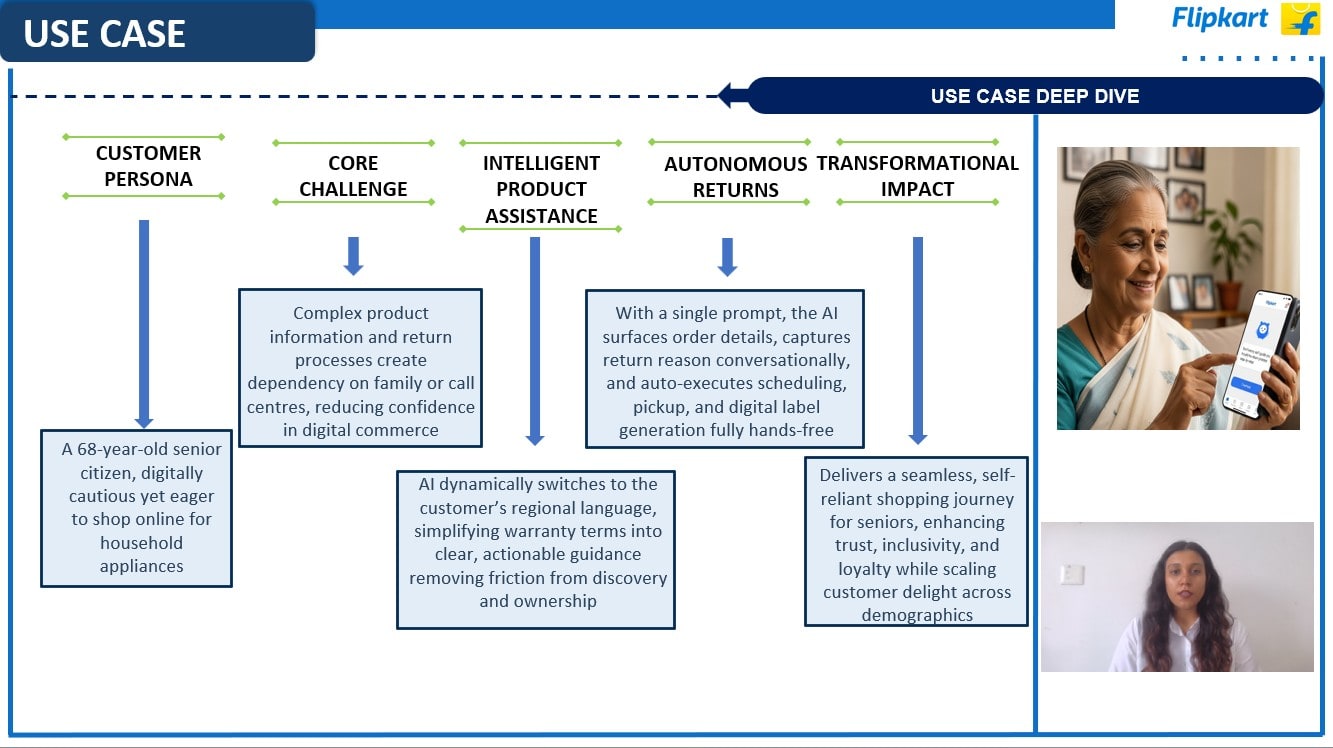 Among the Flipkart users in India, people above the age of 60 amount to approximately just 4.9% of the customer base! Qualitative methods confirmed that senior citizens found the tech-heavy approach of e commerce to be an entry barrier. To solve this, we propose the idea of an AI-agent-based chatbot that understands user intent and performs actions accordingly. Think of it like a personal AI-assistant for all your shopping needs. Unlike a conversational LLM-based bot that provides text-based replies, our agentic-ai bot is capable of performing actions like cancelling an order, scheduling a return, and more through voice commands or via text. We plan to integrate all major regional languages in the bot to eliminate the barrier of English & Tech, which will attract significantly more customers from a diverse nation like India. This strategy will not only help in customer acquisition but also enhance the business operations as well. Flipkart currently has a lot of product returns, and using an AI assistant to understand the user intent and address the customer complaints will free up the customer service team for more strategic work. To further illustrate the working of our bot, we have included a use case of how our product feature makes the user journey of a Flipkart customer much easier as well.