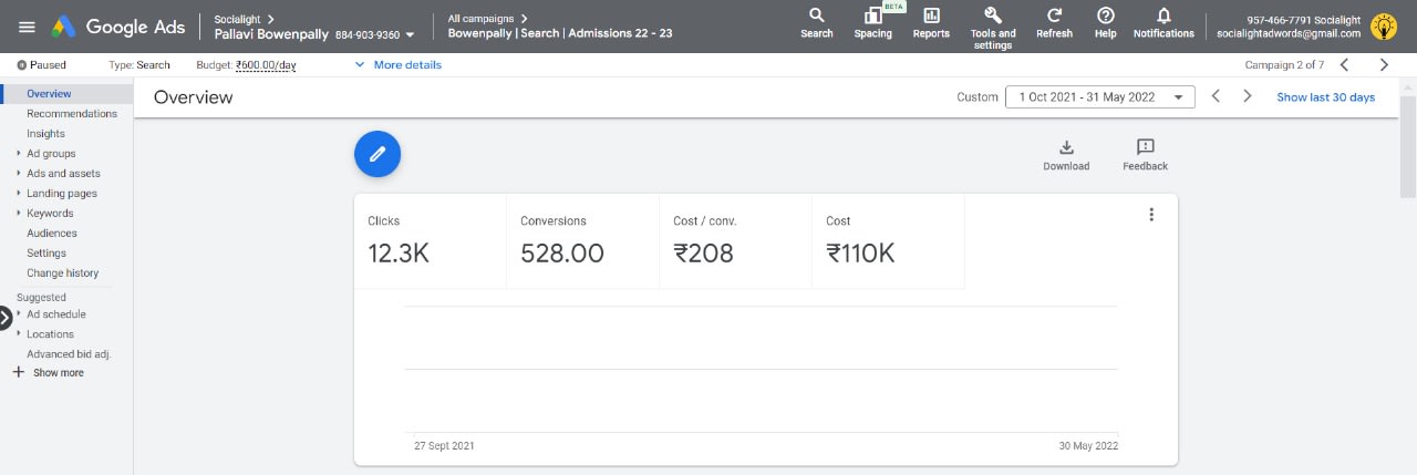 Ran a Google Ads search campaign for a reputed school brand to generate admission inquiries for the 2022–2023 academic year. The campaign ran for 8 months across high-intent keywords targeting parents in specific localities.