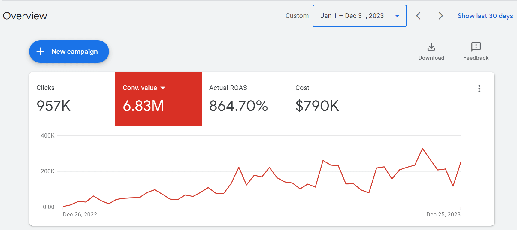 By spending $790K on Google ads got $6.8M of sale with 8.6 ROAS for an USA ecommerce store.