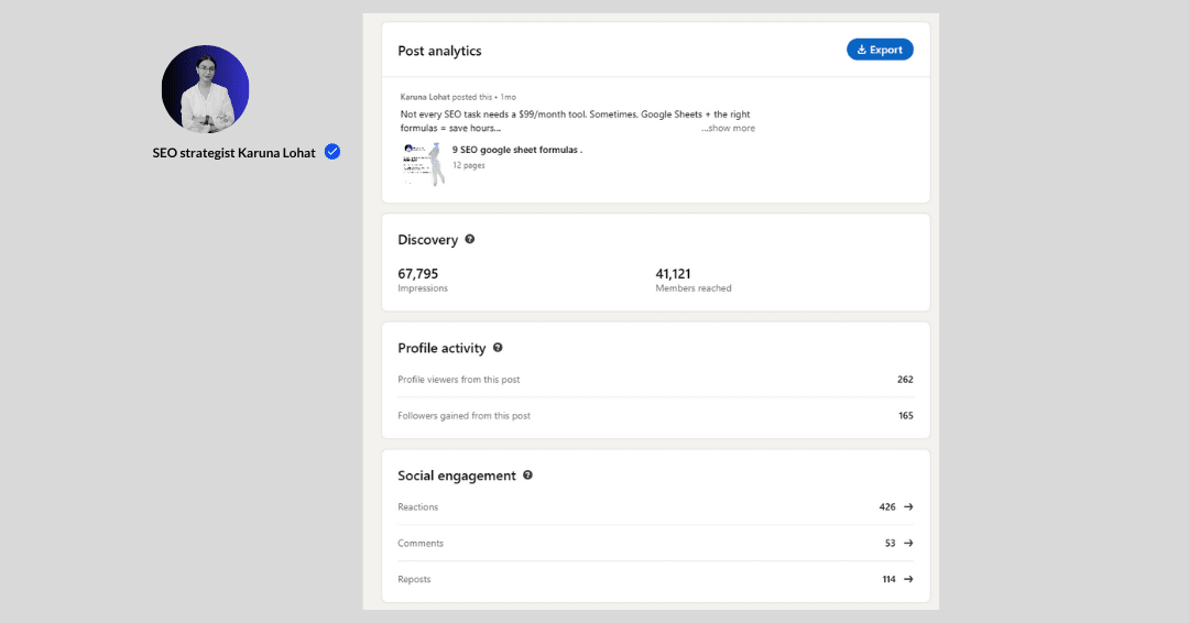 I actively share content on LinkedIn around my SEO approaches, strategies, and real-world learnings. One of those posts “9 SEO Google Sheet Formulas” went viral.