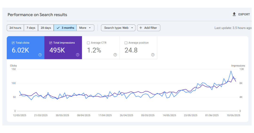 Achieved a remarkable 698% increase in organic clicks and 495,000 impressions within just 3 months (March 12, 2025 – June 11, 2025) for an e-commerce client. This growth was the result of a strategic blend of high-quality backlink acquisition, conversion rate optimization (CRO), and significant improvements to the website’s UI/UX. The outcome: sustained SEO performance and a notable boost in conversions.