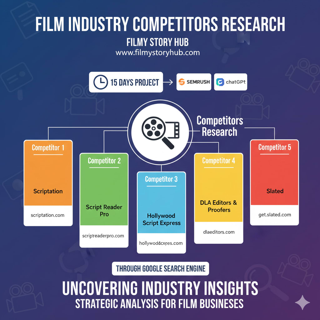 This is the competitors Research done for Film Story Hub https://www.filmystoryhub.com website. I have found five websites which are competitors to Filmy Story Hub,Competitor 1-name : Scriptation (https://scriptation.com/),Competitor 2 Name: Script Reader Pro (https://www.scriptreaderpro.com),Competitor 3 Name:Hollywood Script Express(https://www.hollywoodscriptexpress.com/),Competitor 4 Name: DLA Editors & Proofers (https://www.dlaeditors.com/),Competitor 5 Name: Slated (https://get.slated.com/)through Google search Engine, used Semrush for research and analysis. It took 15 days for doing this project. I have also used ChatGPT for getting ideas.