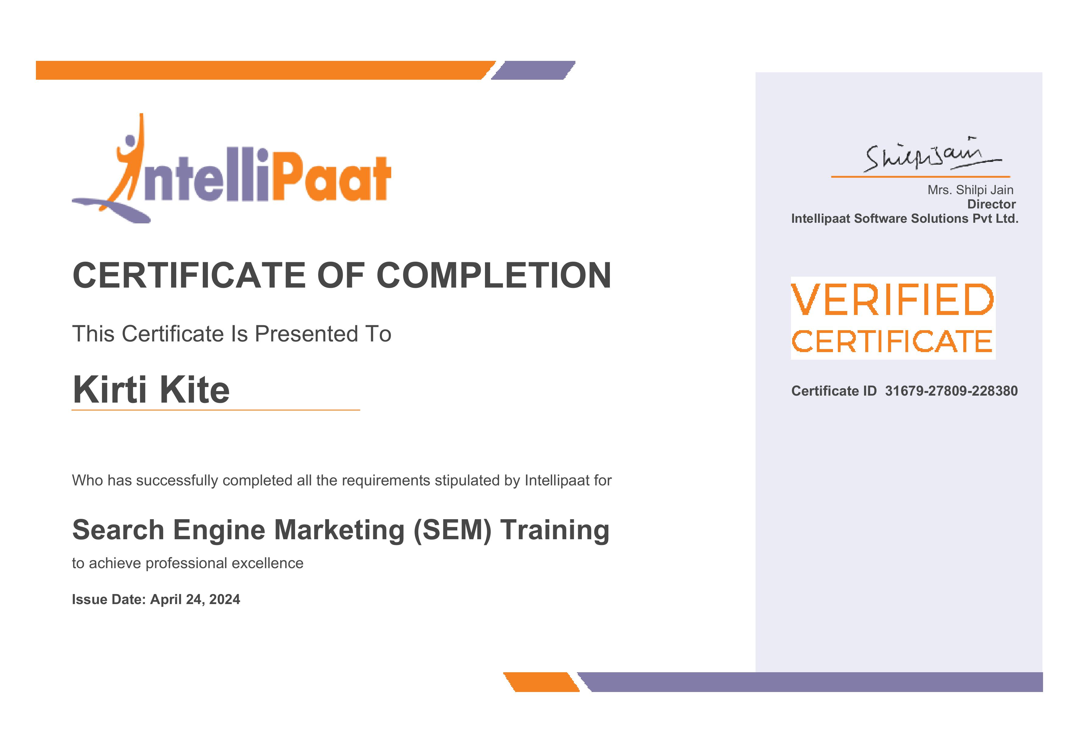 I have completed Search Engine Marketing Training from Intellipaat on 24/04/2024