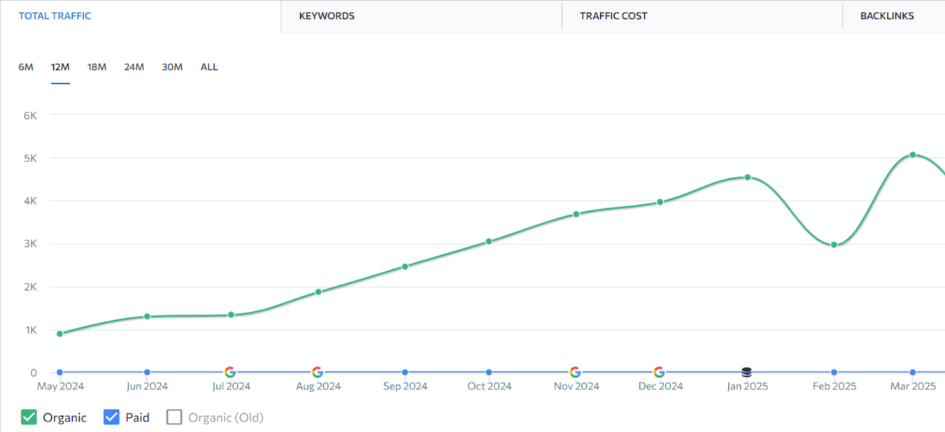 🔎 Traffic growth directly correlated with keyword expansion and SERP visibility.