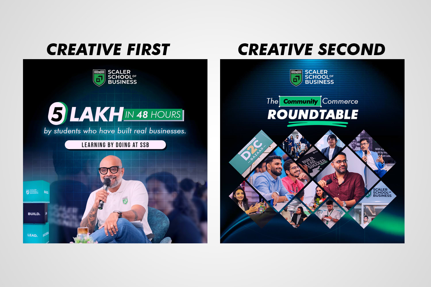 Creative 1 focuses on real proof by showing ₹5 lakh revenue made in 48 hours. This helps to catch attention and build trust, especially for people who are tired of only theory-based education.