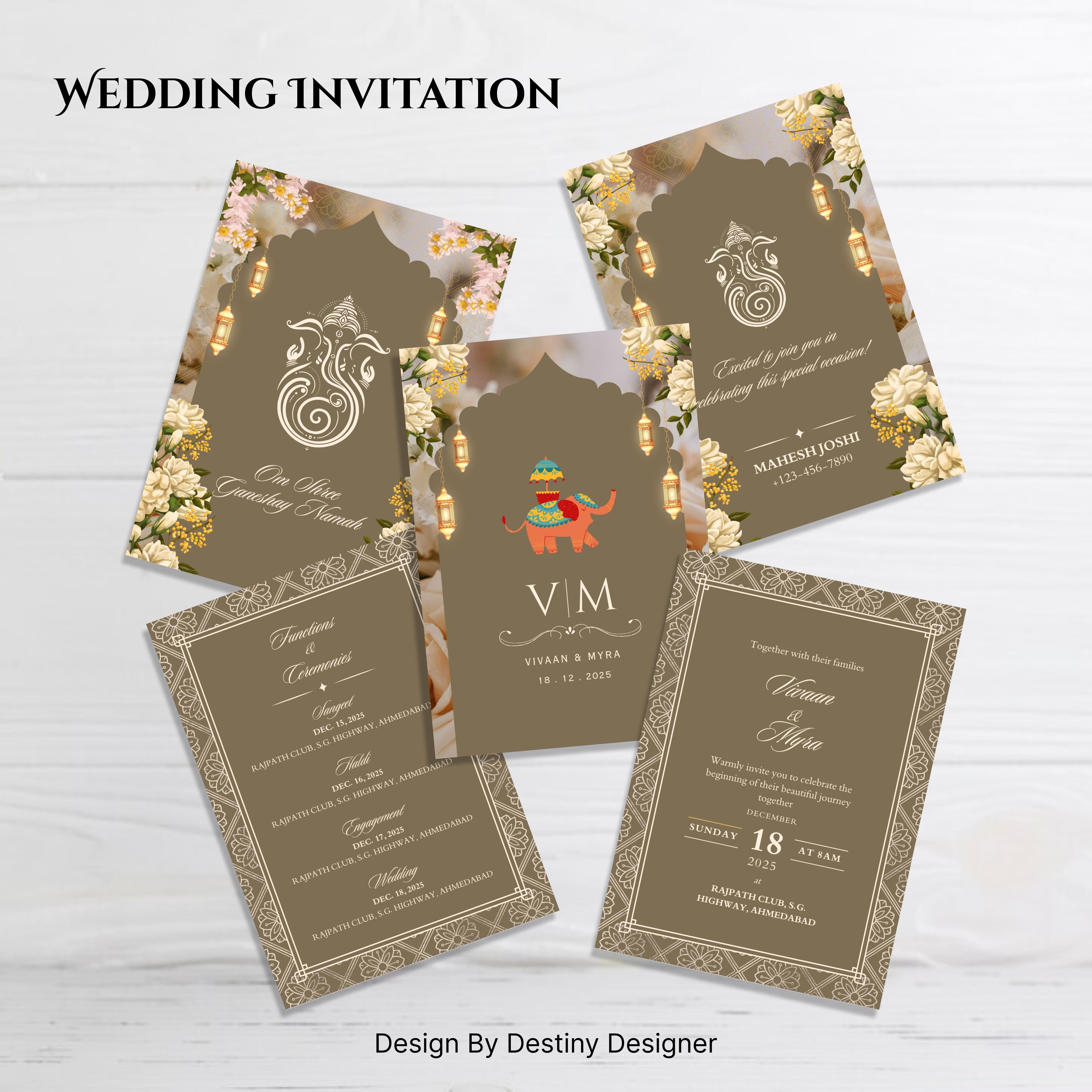 I designed this traditional yet modern wedding invitation suite for the wedding of Vivaan and Myra. The set includes multiple coordinated cards covering invitation details, RSVP information, and ceremony timelines. Inspired by Indian motifs and floral elements, the design blends elegance with festive charm.