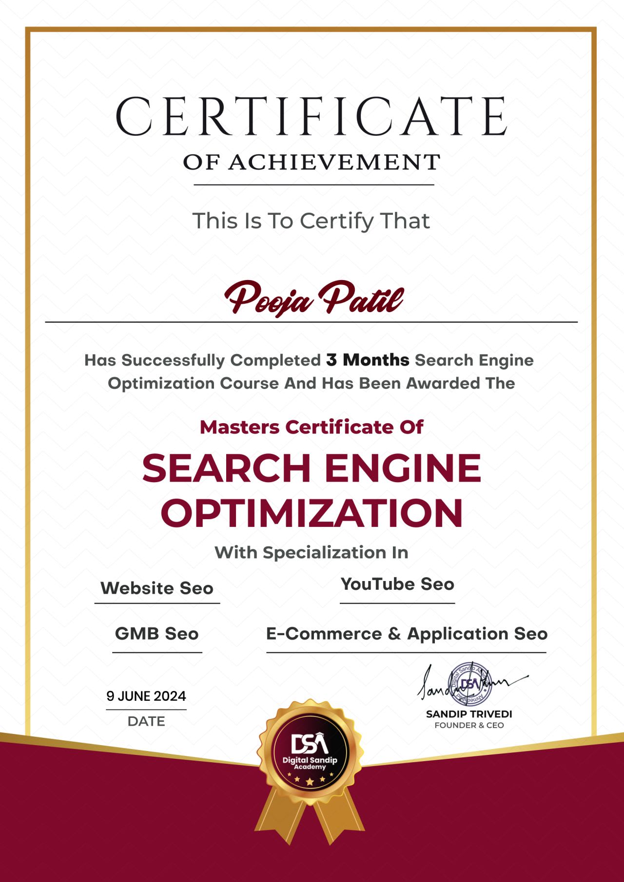 This is to certify that Pooja Patil has successfully completed a 3-month search engine optimisation course and has been awarded the master's certification of search engine optimisation with specialisation in website SEO or YouTube SEO & GMB SEO, e-commerce & application SEO.