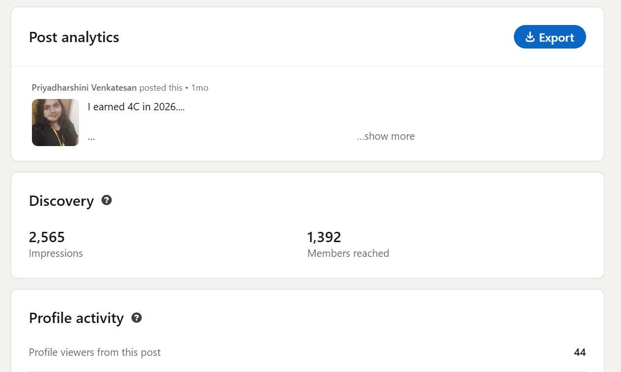 Writing best LinkedIn post content for my personal branding got me a better reach and gained more connections.