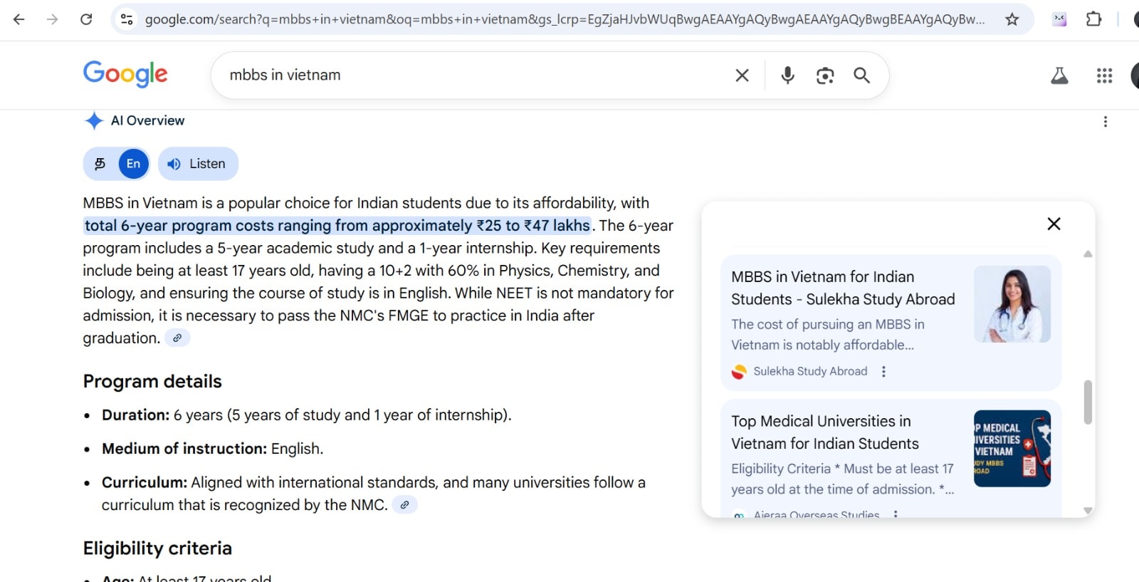 Created an SEO-optimized blog that ranked in Google’s AI Overview for the keyword MBBS in Vietnam, focusing on cost and affordability insights. Delivered clear, research-backed content and strong on-page SEO, resulting in top visibility in Google’s newest SERP feature.
