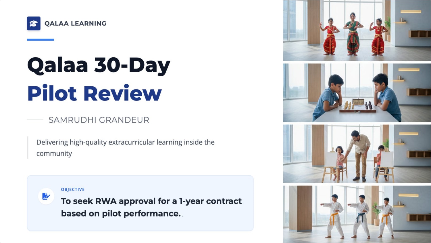 Design and execute a 30-day community pilot for Qalaa inside a 600-home apartment complex to secure RWA approval for a 1-year paid contract based on participation, feedback, and smooth operations.