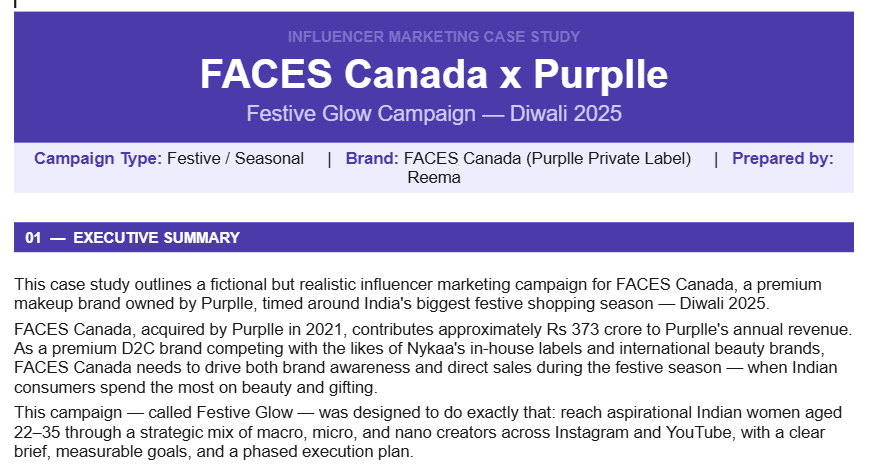 This is a self-initiated case study based on a festive influencer marketing campaign for FACES Canada. The campaign is planned around Diwali to drive brand awareness and product sales through Instagram and YouTube.