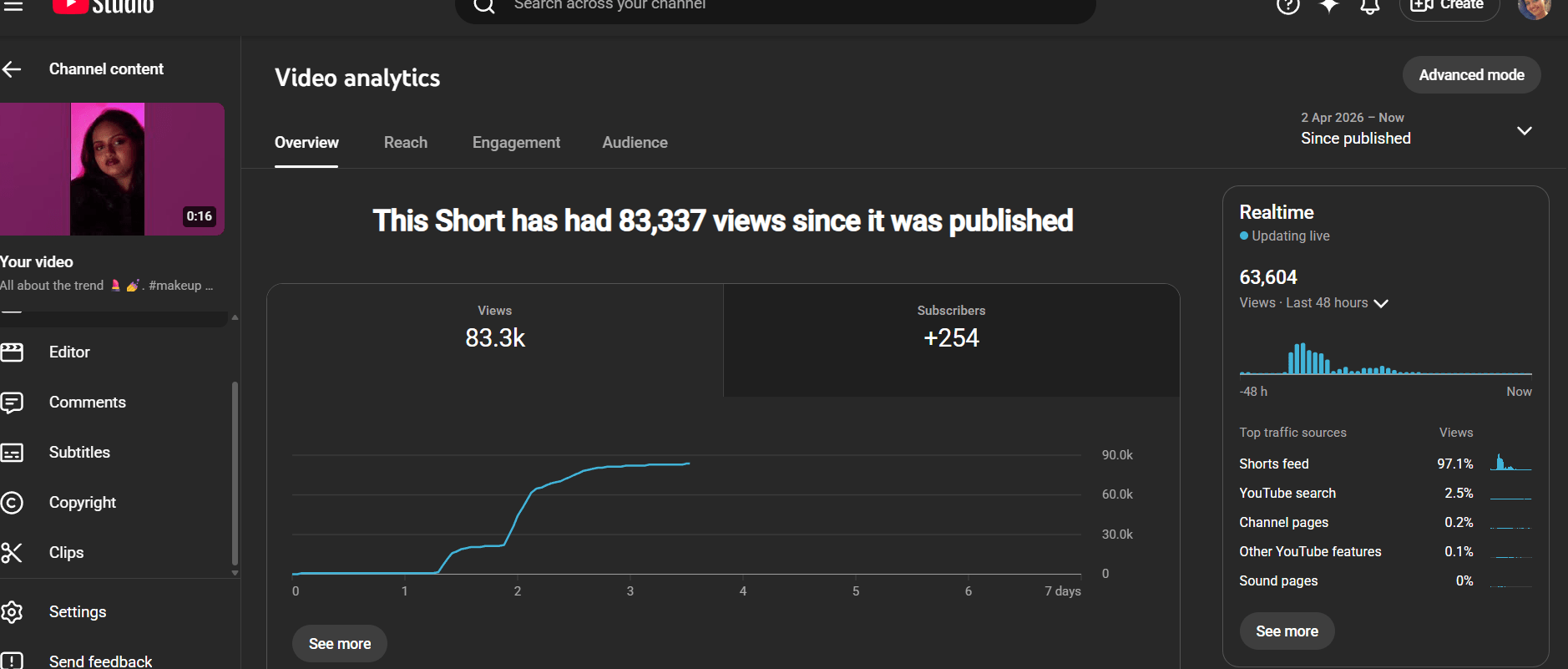 I created a makeup transition video on YouTube that reached around 83K views within 24 hours, with 2K+ likes and an average retention rate of about 80%. I used a trending audio and relevant hashtags to boost reach and performance, which helped me gain 200+ subscribers from a single video. This project reflects my interest and skills in content creation and social media management, including planning, filming, editing, and optimizing content. The entire process took me around 3–4 hours from start to finish.