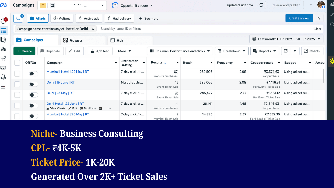 Generated over 300+ Paid Ticket Sales Month on Month for Physical Business Coaching Event