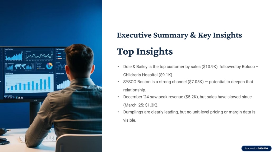 Top customers: Dole & Bailey ($10.9K), Boloco – Children’s Hospital ($9.1K), SYSCO Boston ($7.05K).