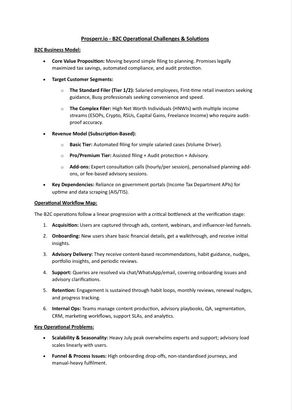 To analyze Prosperr.io’s B2C customer operations and identify key operational bottlenecks, scalability issues, and CX gaps, then propose practical fixes to improve onboarding, fulfilment quality, retention, and operational efficiency.