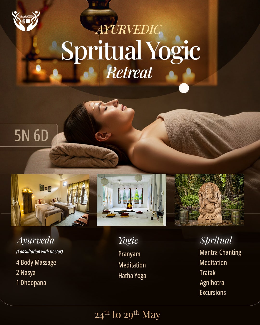 The Ayurvedic Spiritual Yogic Retreat's design was created to promote healing, serenity, and spiritual depth. The core image of a woman receiving Shirodhara therapy immediately links visitors to the Ayurvedic topic, while the warm golden tones and lighted background provide a calming mood. The name of the retreat and important information like the dates and duration are highlighted by elegant font that combines classic and modern styles. The information is arranged into three distinct categories: spiritual, yogic, and ayurvedic. Each category is supported by pertinent images to improve comprehension. All things considered, the design keeps a calm, well-balanced style that successfully conveys the spirit of the retreat while yet being aesthetically pleasing and simple to use.