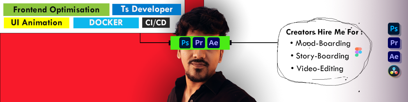 What I do ? @Video Editing ✔️ Documentary, Podcast, Vlog, Interview ✔️ Ads / Reels / shorts ✔️ Color/Sound Design @Software- Frontend / Backend ✔️ UI-Animation ✔️ Docker / CI-CD