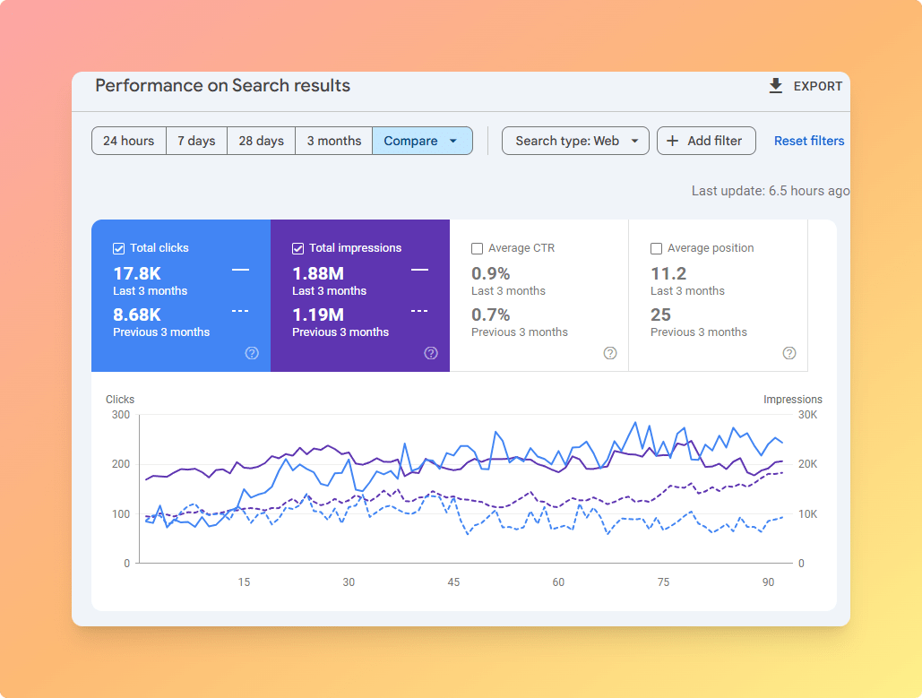 Glamar.io saw strong SEO lift over the last quarter — increasing clicks from 8.6K to 17.8K and impressions from 1.19M to 1.88M. Improvements were driven by keyword-aligned content refreshes, optimized metadata, UX & CWV enhancements, and building high-intent landing pages for beauty-focused search intents.