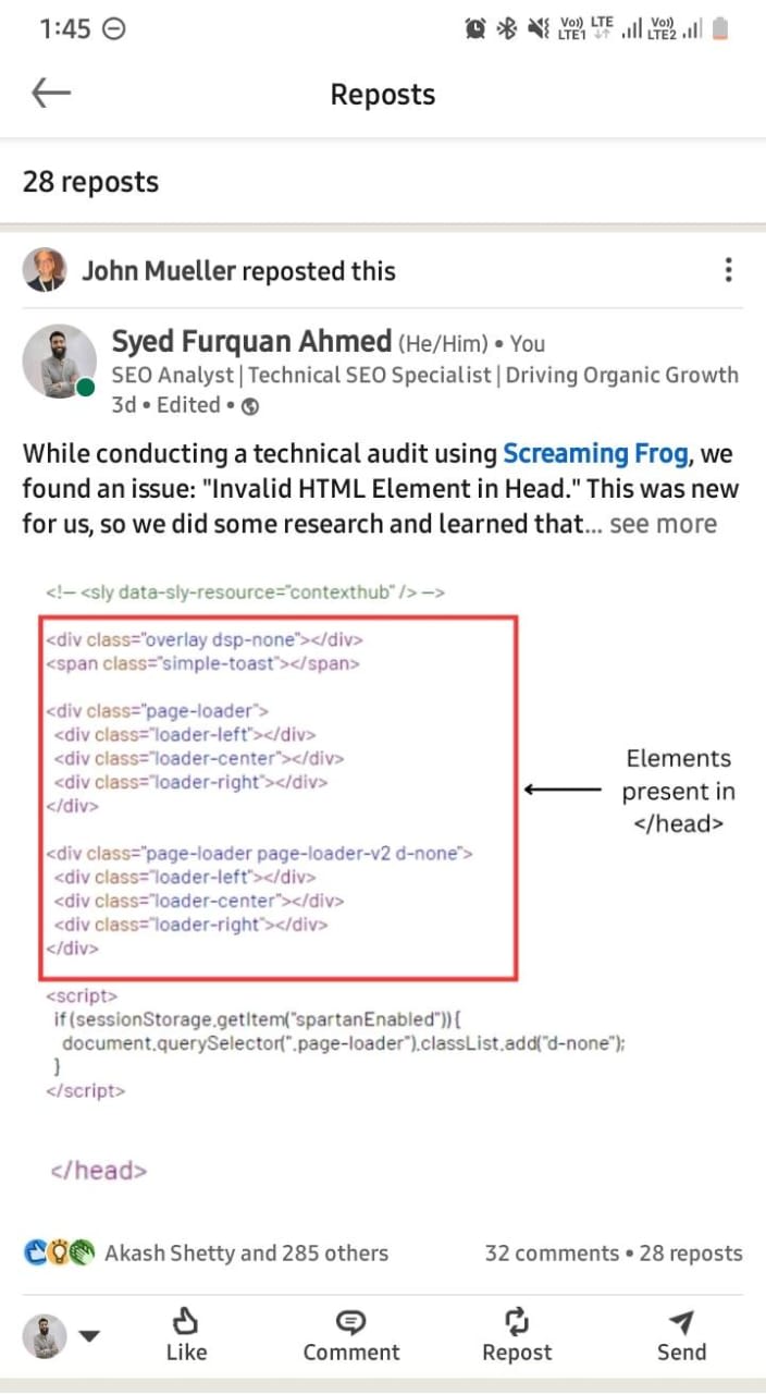 A technical SEO post I shared was reshared by John Mueller, highlighting my commitment to sharing authentic, valuable insights on LinkedIn. Unfortunately, the original post was later removed when my account was compromised, but this recognition underscores the quality and reliability of the content I consistently produce.